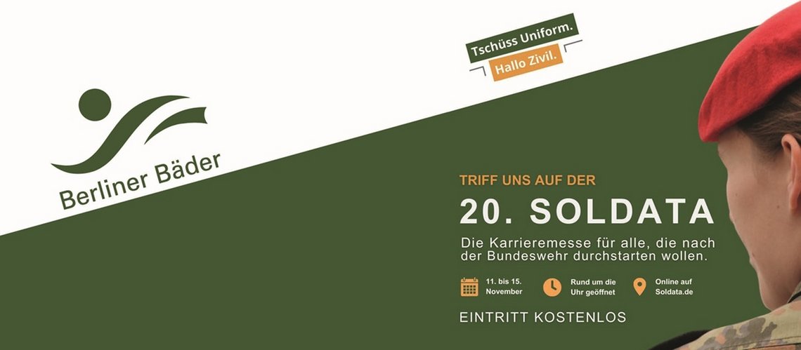 Die Berliner Bäder-Betriebe sind mit einem virtuellen Stand dabei und zeigen dir, wie du deine Erfahrung, Disziplin und Teamgeist in spannende neue Aufgaben einbringen kannst – ob im technischen Bereich, in der Verwaltung oder direkt im Bäderbetrieb.