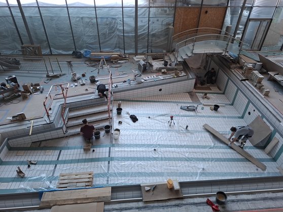 Der Baufortschritt im Stadtbad Schöneberg ist deutlich erkennbar. Die meisten Becken und die Whirlpools im denkmalgeschützten Bad an der Hauptstraße sind bereits neu gefliest; derzeit laufen die Fliesenarbeiten im letzten noch ausstehenden Innenbecken. Zur Teilsanierung des Stadtbades Schöneberg gehören neben den Becken auch die Badewassertechnik, die Brandmeldeanlage sowie Teile der Fassade. Die Arbeiten werden bis zum 2. Quartal 2026 dauern.