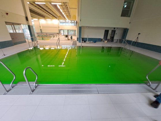 Die neue Technik in der Schwimmhalle Zingster in Hohenschönhausen hat einen wichtigen Test bestanden: den so genannten Färbetest. Damit wird untersucht, ob sich die Desinfektionsprodukte – also das Chlor – gut im Wasser verteilen lassen und ob das Becken komplett durch frisch eingeleitetes Wasser durchströmt wird. Zur besseren Veranschaulichung wird beim Test Färbemittel verwendet. Innerhalb von 15 Minuten muss sich die Farbe im Becken verteilt haben. Der Test wurde auf Anhieb bestanden. Das Bad wird seit 2023 teilsaniert. Die Wiedereröffnung der Halle ist für Mitte Dezember 2025 geplant.