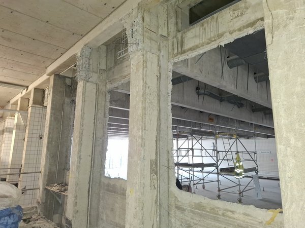 Im Wellenbad am Spreewaldplatz schreiten die Rohbauarbeiten weiter voran. Die ersten neuen Elemente der technischen Gebäudeausrüstung wurden bereits eingebaut. Außerdem sind einige Haustechnik-Bauteile (z.B. Unterkonstruktionen für Duschen und WCs) bereits montiert.